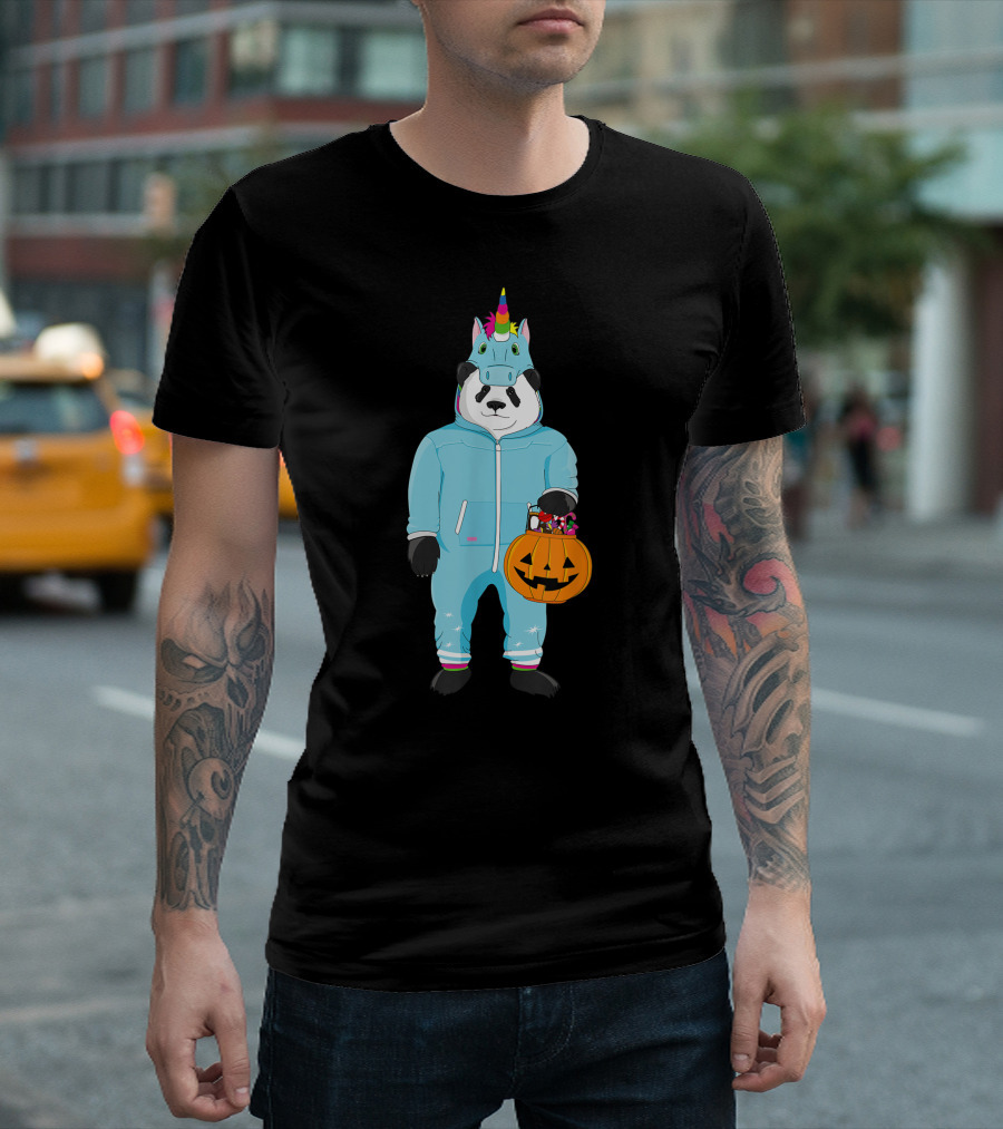 Panda Wearing Unicorn Costume Holding Spooky Pumpkin Lantern In Halloween T-Shirt