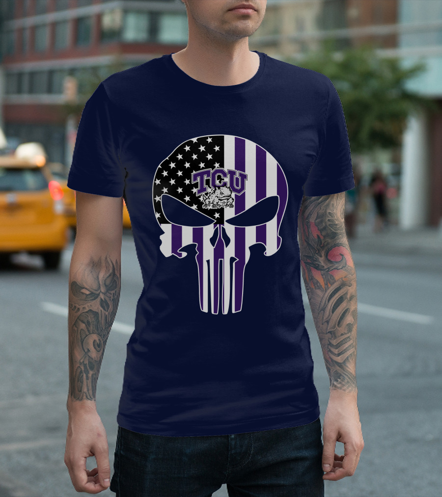 Tcu Horned Frogs Logo With American Flag Punisher Skull T-Shirt