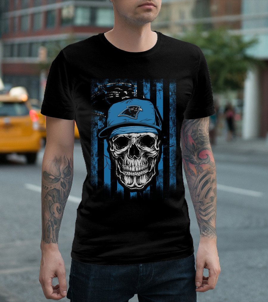 Skull Wearing Carolina Panthers Hat With Blue And Black Stripes T-Shirt