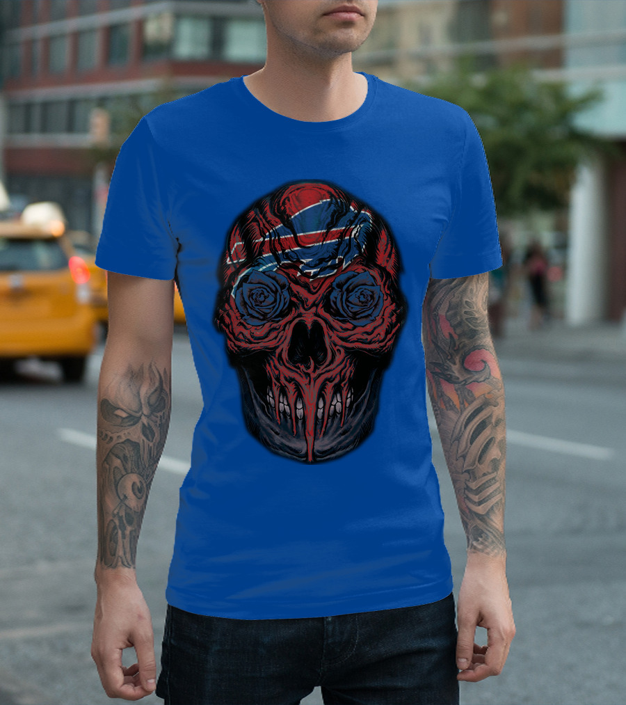 Buffalo Bills 34 Skull With Blue And Red Rose Eyes On Blue T-Shirt