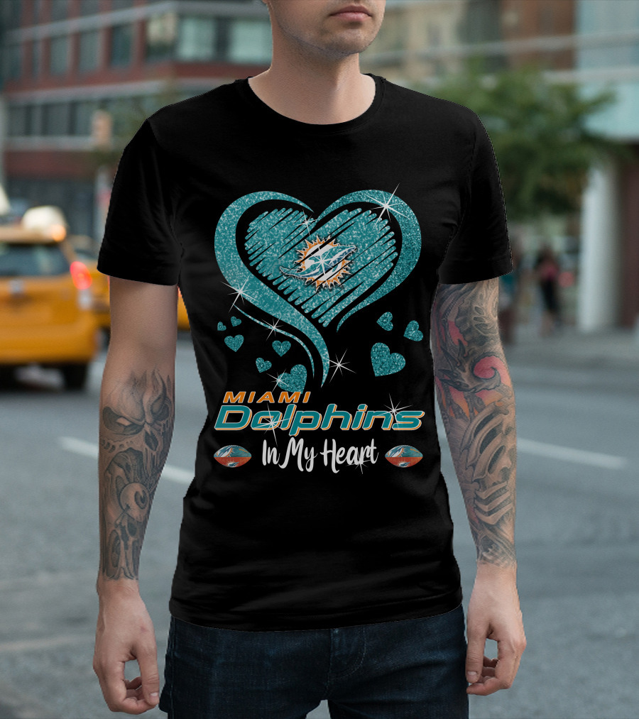 Miami Dolphins In My Heart Sparkling Teal Design With Logo And Hearts T-Shirt