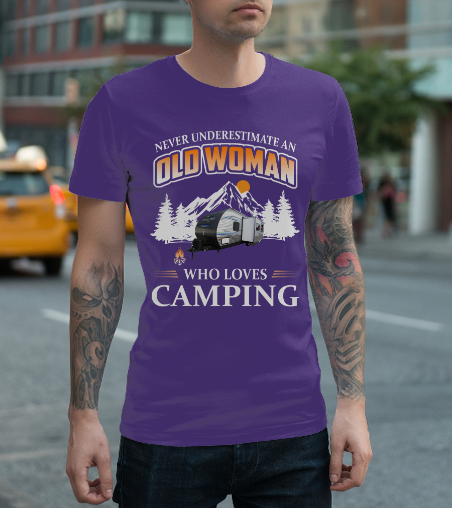 Never Underestimate An Old Woman Who Loves Camping Coachmen Catalina Travel Trailer T-Shirt