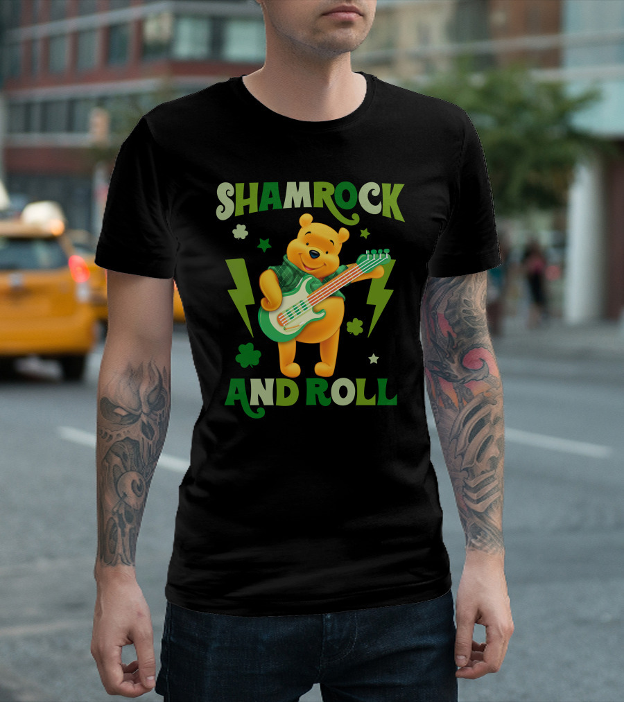 Shamrock And Roll Pooh Bear With Guitar And Green Lightning Bolts T-Shirt