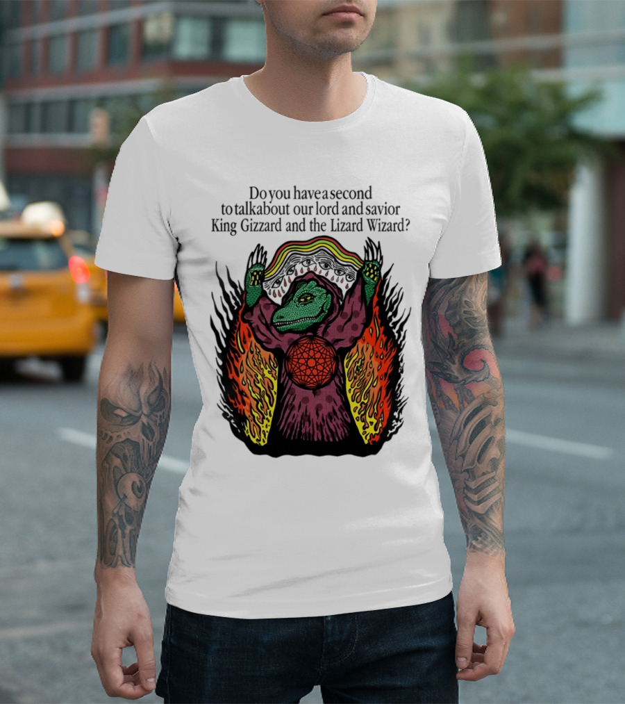Facestabberxoxo Do You Have A Second To Talk About Our Lord And Savior King Gizzard And The Lizard Wizard Flamboyant Reptile Worship Scene T-shirt — on-model street pose, front view.