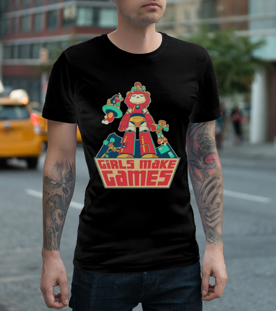 Castpixel Girls Make Games Robot Adventure Scene T-shirt — on-model street pose, front view.