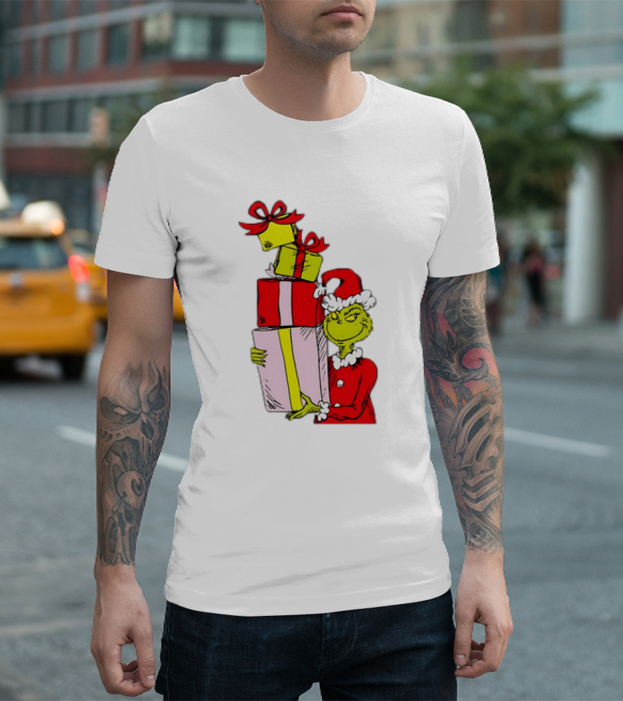 Grinch With Stacked Christmas Gifts Santa T-Shirt