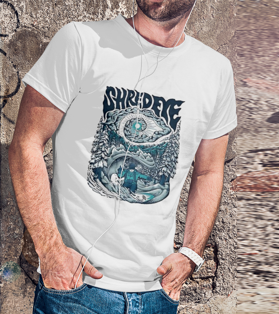 Shredeye Snow Surfer Forest Adventure T-shirt — on-model street pose, front view.