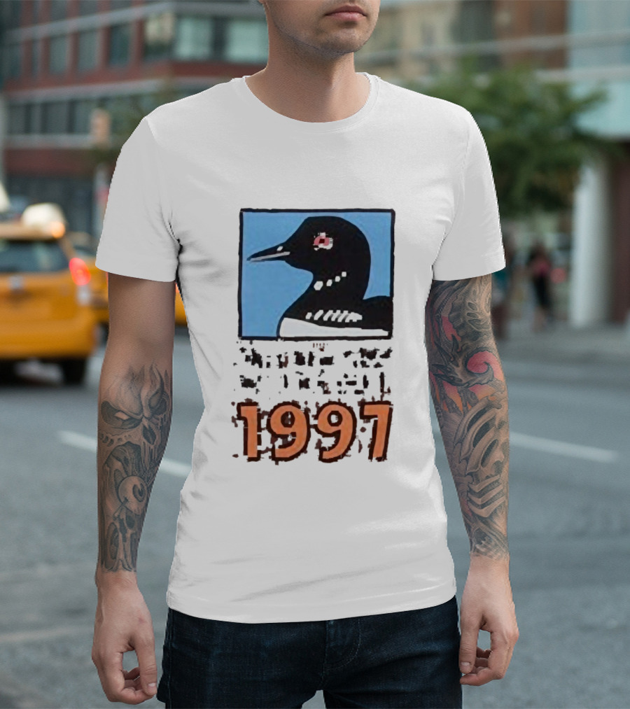 Only New York Wildlife Dept 1997 Loon Wildlife Iconic Bird Emblem T-shirt — on-model street pose, front view.