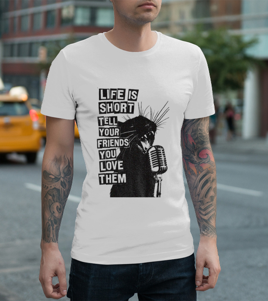 Life Is Short Tell Your Friends You Love Them Black Cat Microphone T-Shirt