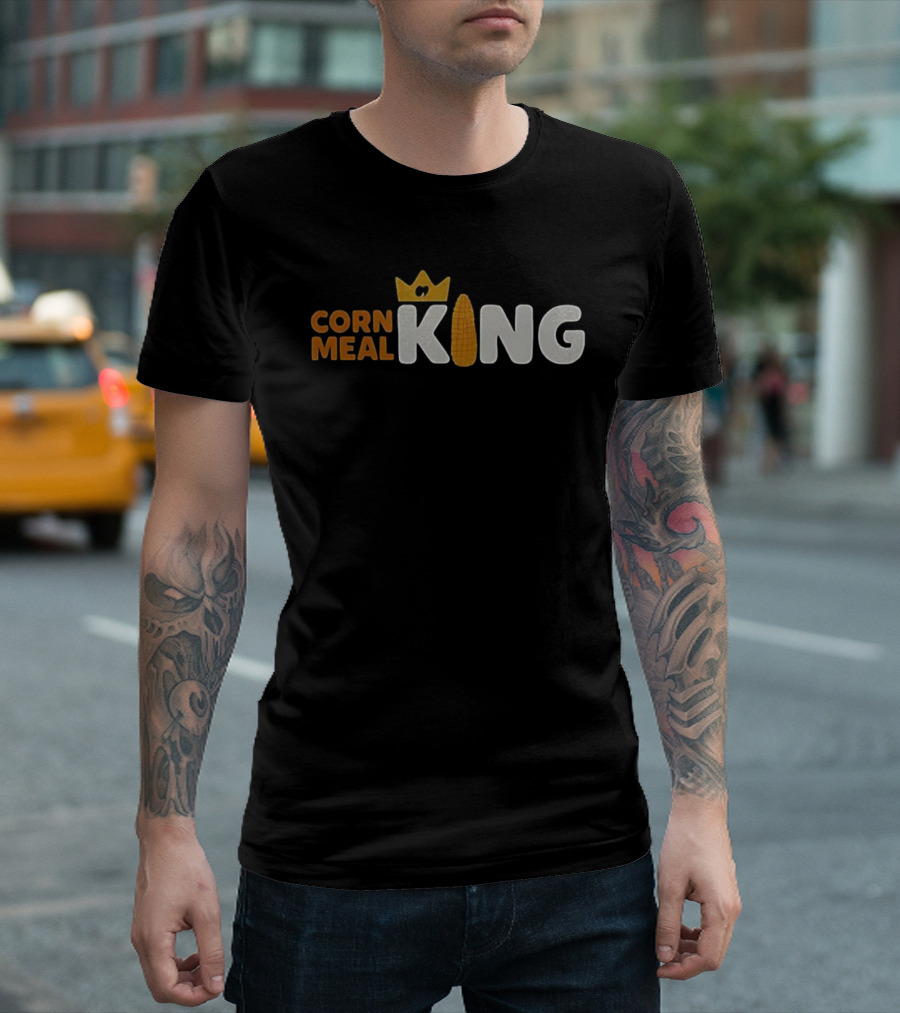 Corn Meal King Corn Icon Crown Logo G9 Text Graphic T-shirt — on-model street pose, front view.