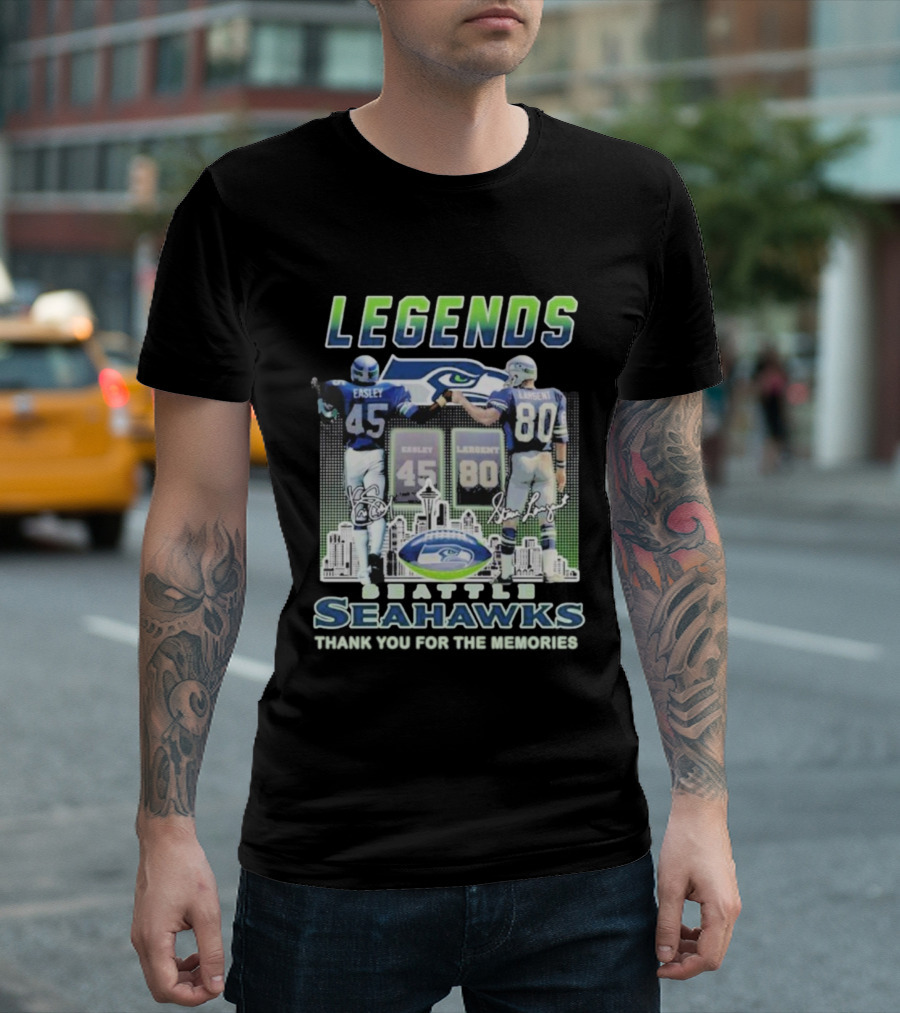 Kenny Easley Steve Largent Legends Seattle Seahawks Signatures 45 80 Icons T-shirt — on-model street pose, front view.
