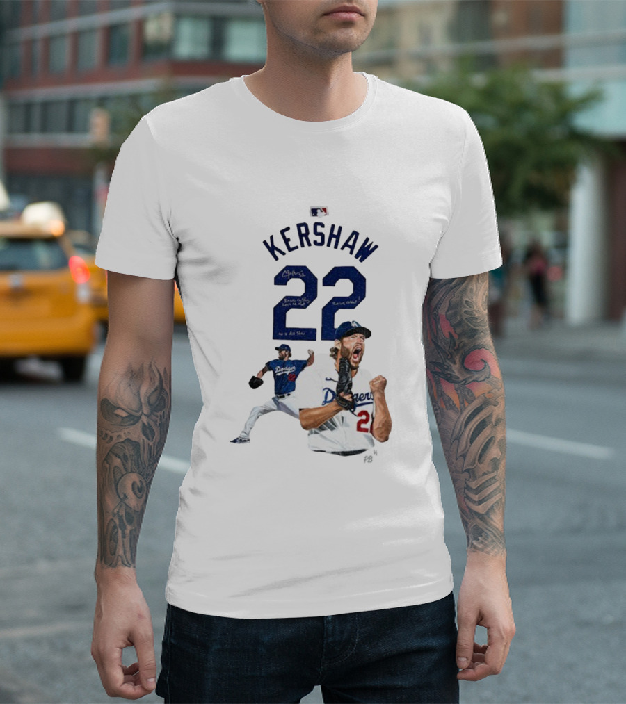 Kershaw 22 Los Angeles Dodgers MLB Signature Series MVP World Series Icon 2025 T-shirt — on-model street pose, front view.