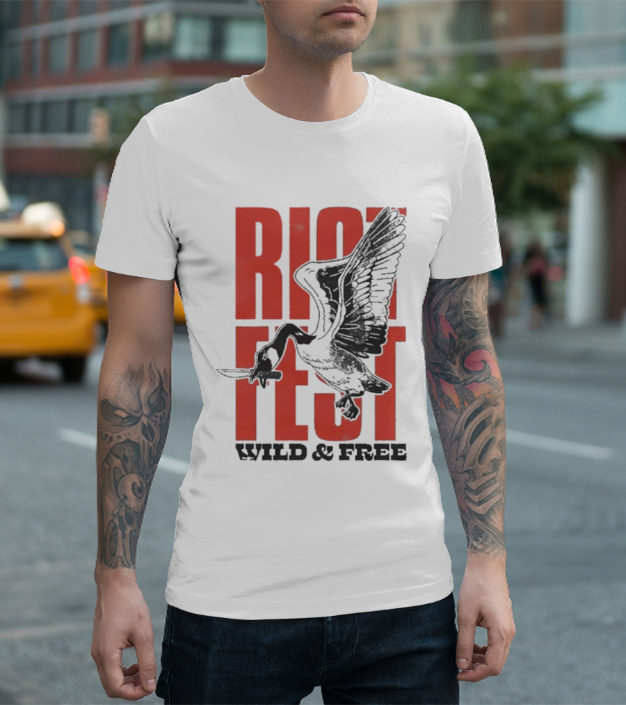 Riot Fest Wild And Free Goose Knife Iconic Design T-shirt — on-model street pose, front view.
