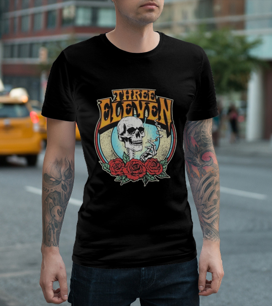 Three Eleven Smoking Skull With Roses Vintage Style T-Shirt