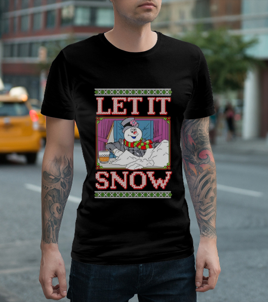 Let It Snow Christmas Snowman With Snow And Drink Scene T-Shirt