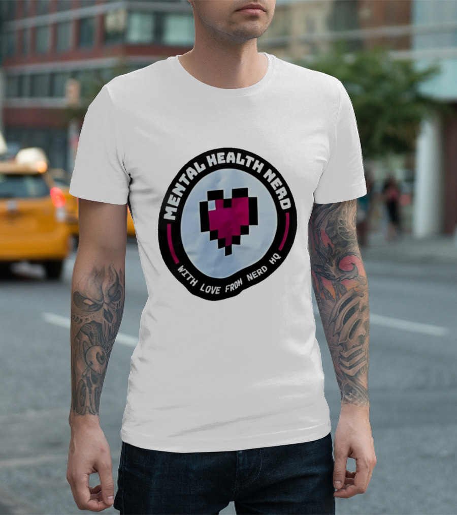 Mental Health Nerd Pixel Heart With Love From Nerd HQ T-shirt — on-model street pose, front view.