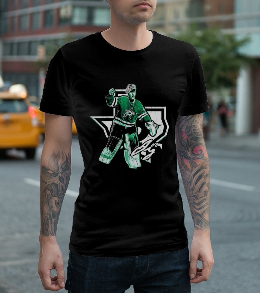 Jake Oettinger Dallas Stars NHL Texas Goalie Iconic Green White Gear Tee — on-model night pose, front view.