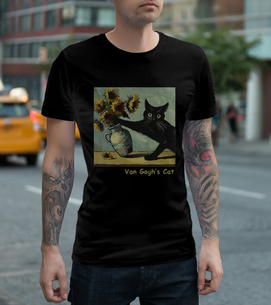 Van Gogh's Cat Sunflowers Funny Art Parody Cat Hugging Vase Painting T-Shirt
