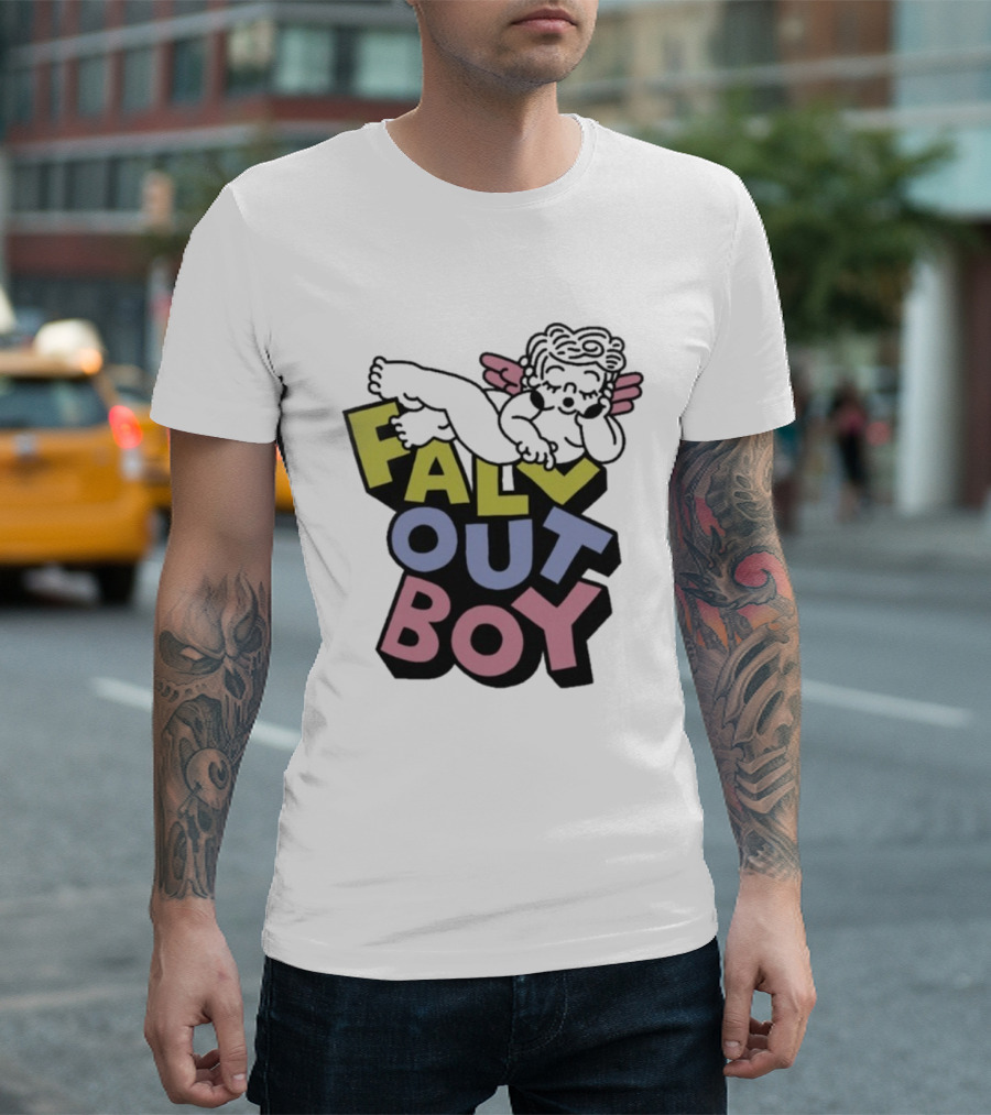 Fall Out Boy Sleepy Angel Iconic Pastel Text T-shirt — on-model street pose, front view.