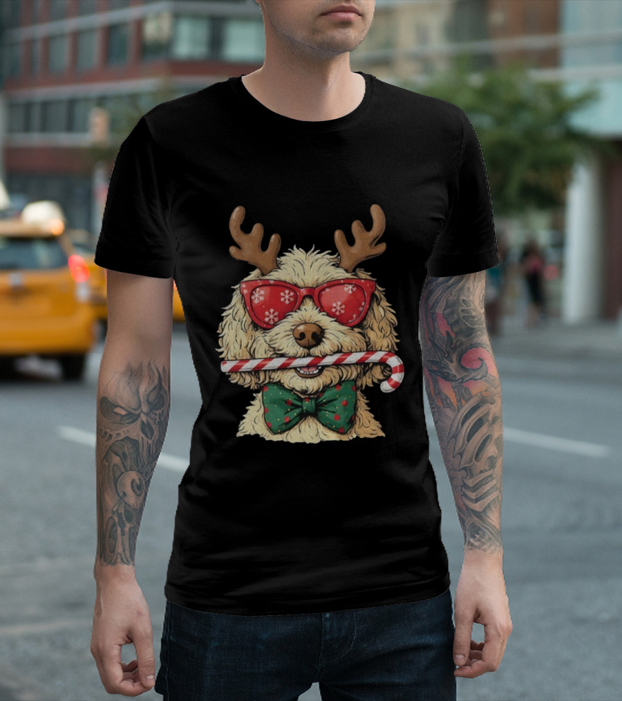 Goldendoodle Reindeer Antlers Candy Cane Snowflake Sunglasses Christmas Bow Tie T-Shirt