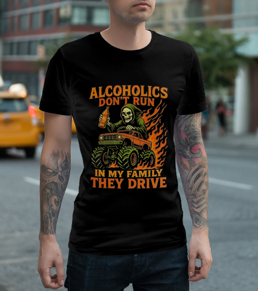 Alcoholics Don’t Run In My Family They Drive Fast Death Burning T-Shirt