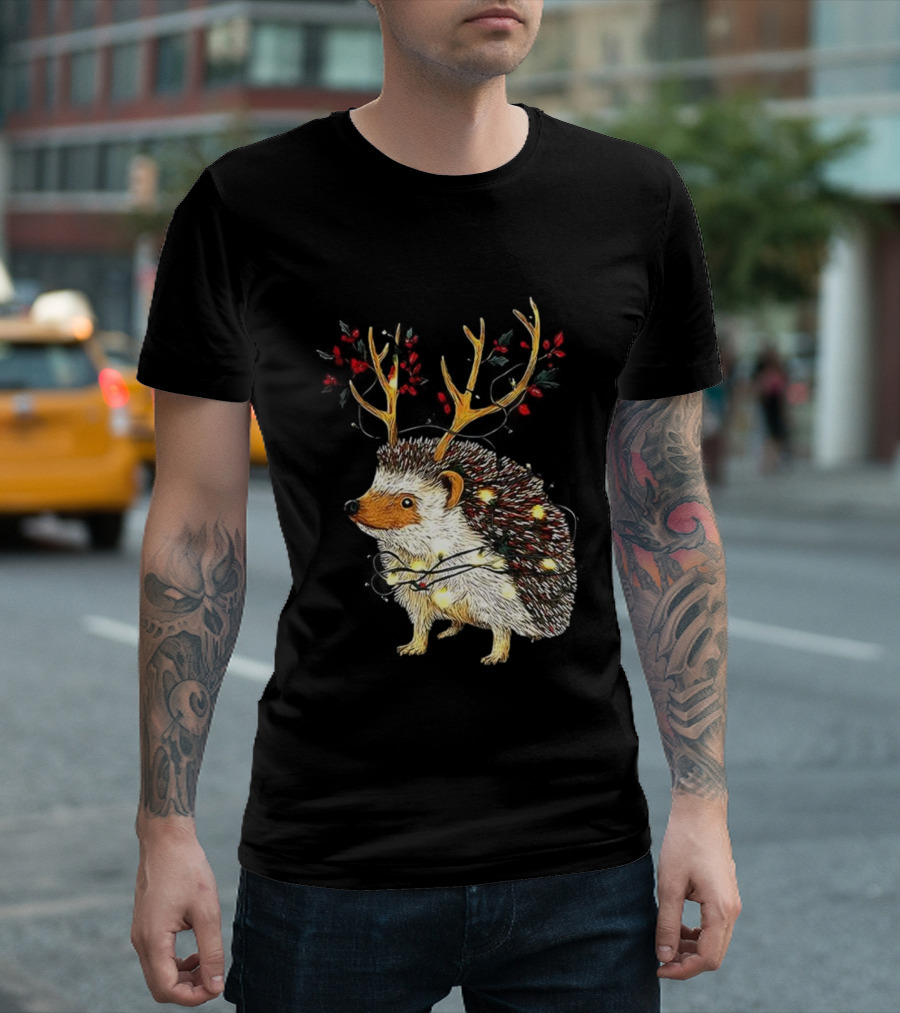 Hedgehog With Antlers Wearing String Of Lights Christmas Holiday Design T-Shirt