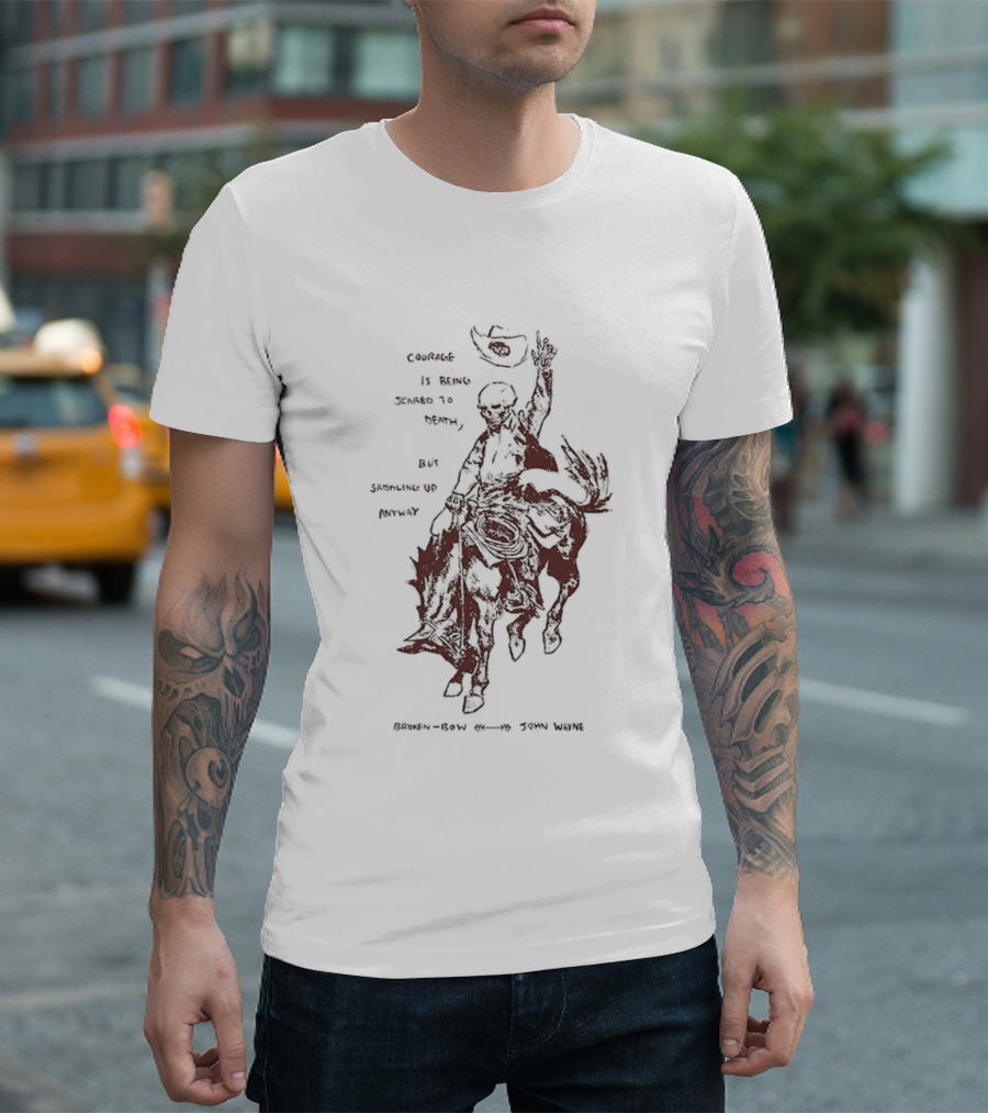 Courage Is Being Scared To Death But Saddling Up Anyway Broken Bow John Wayne Sketch Cowboy Riding Horse T-Shirt