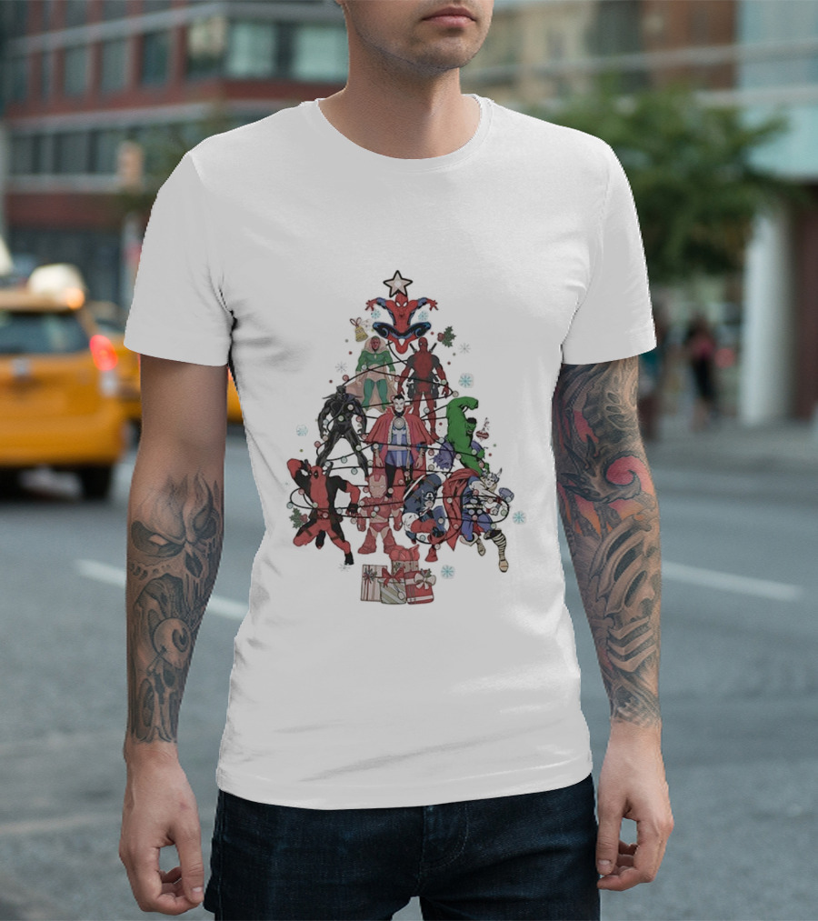 Marvel Superheroes Christmas Tree with Iconic Characters and Festive Star Topper T-shirt — on-model street pose, front view.
