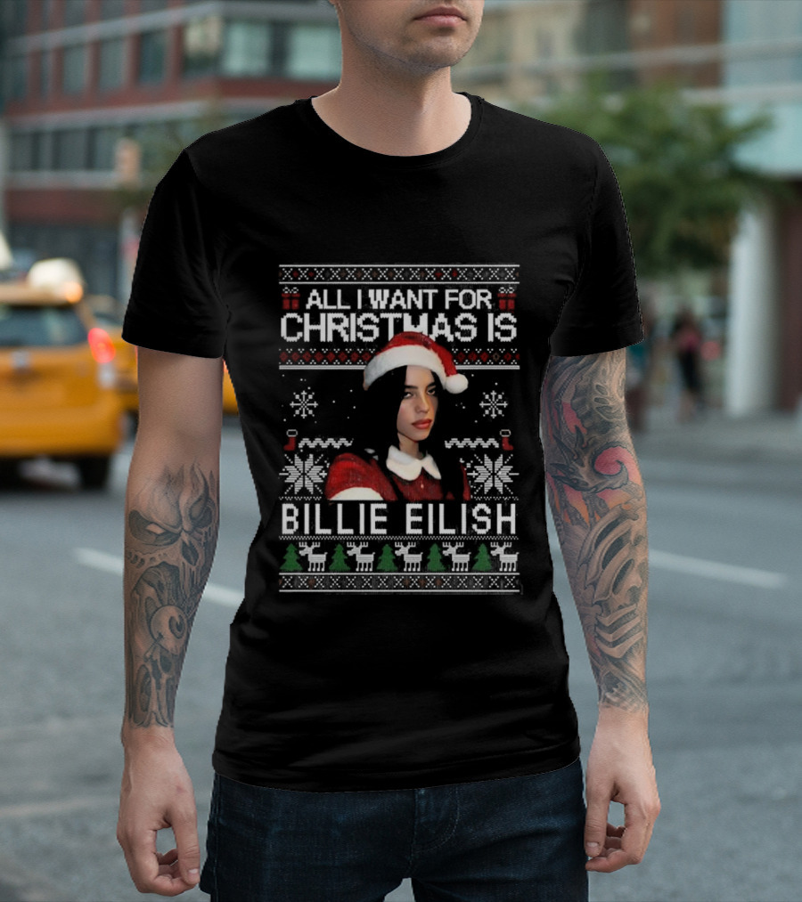 All I Want For Christmas Is Billie Eilish Ugly Christmas Sweater Santa Hat T-Shirt