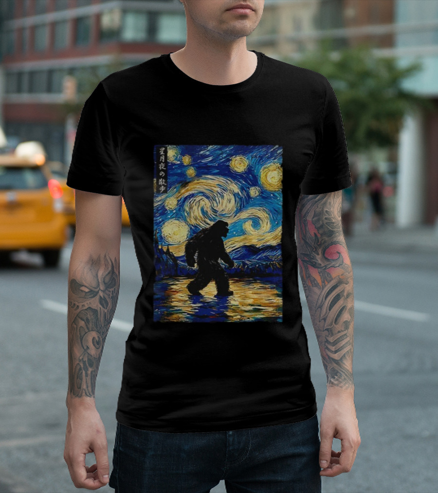 Bigfoot Stroll Under Starry Night Van Gogh Style Japanese Text T-Shirt