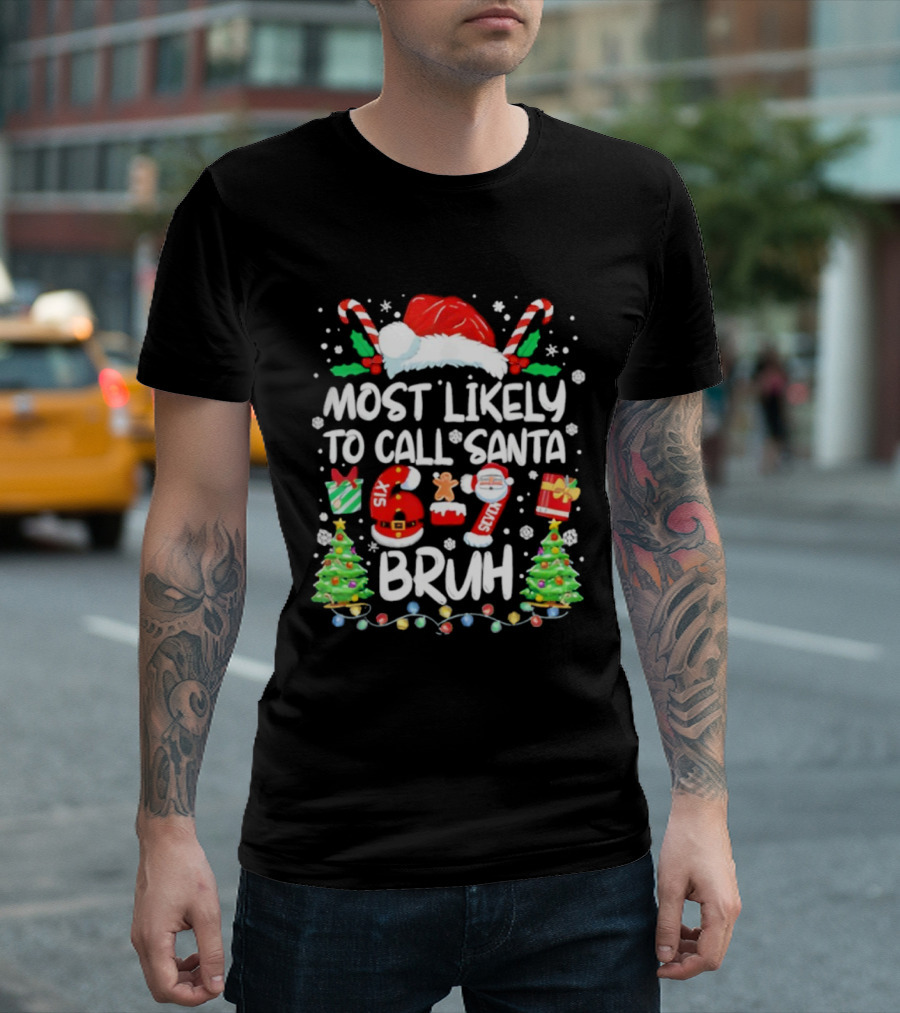 Most Likely To Call Santa 6ix 7even Bruh Christmas Candy Canes Snowflakes Trees T-Shirt