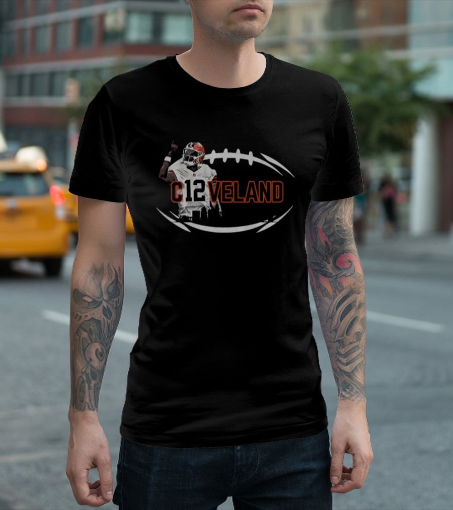 Shedeur Sanders Dawg Pound C12veland Football Icon Celebrating Cleveland Spirit T-shirt — on-model street pose, front view.