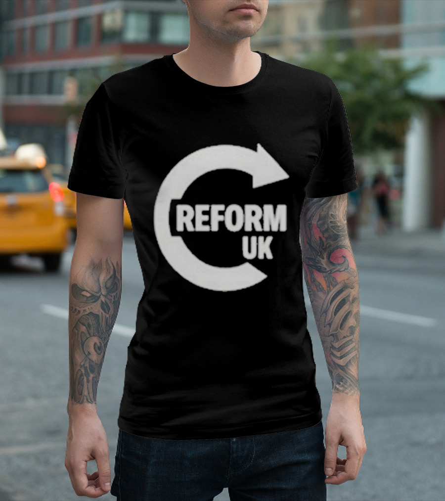 Reform UK Paul Doyle Political Symbol Arrow Circular Icon T-shirt — on-model street pose, front view.