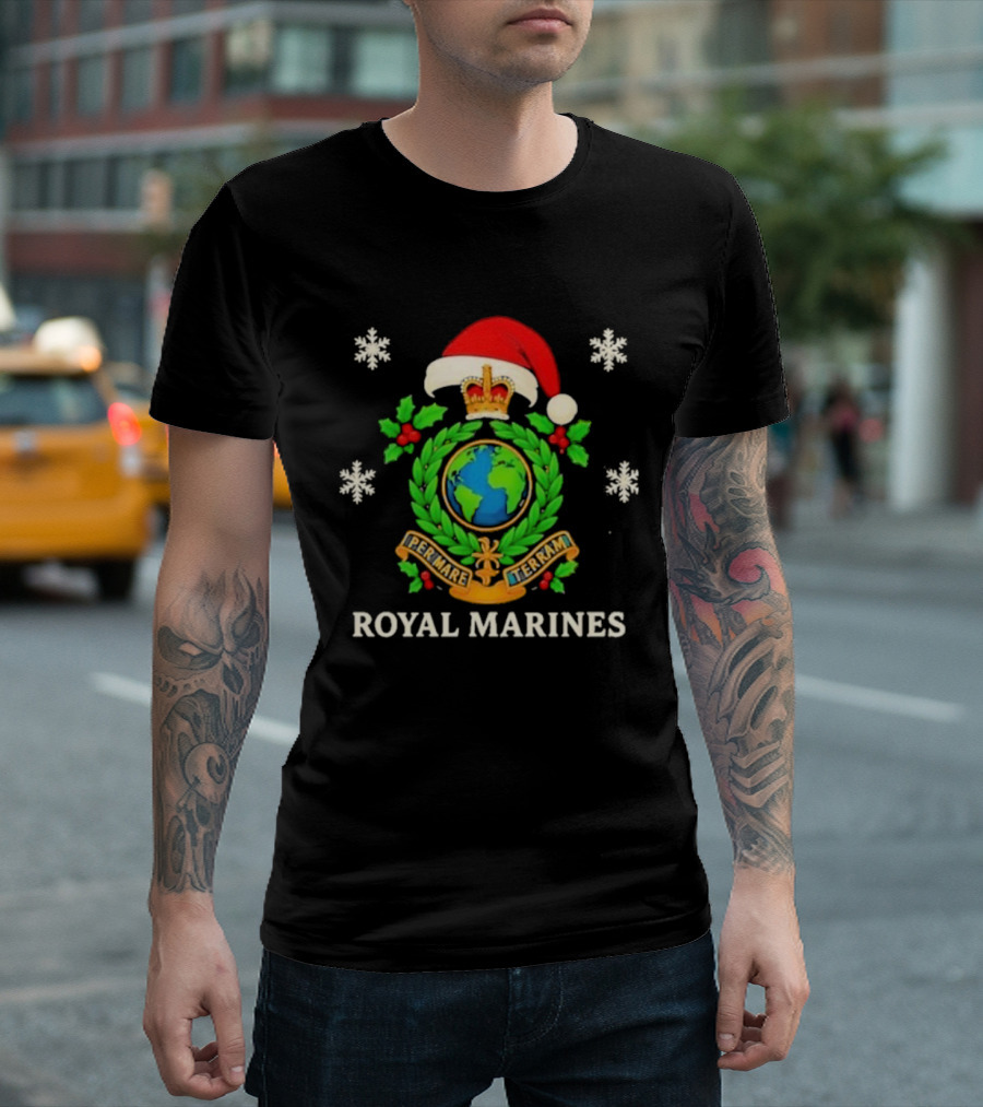 Royal Marines Christmas Per Mare Terram Santa Hat Snowflakes Green Wreath Globe Crest T-Shirt