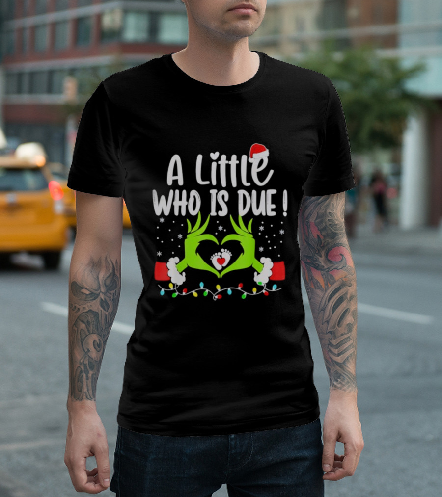 A Little Who Is Due Christmas Pregnancy Announcement Holiday Lights And Santa Hat T-Shirt