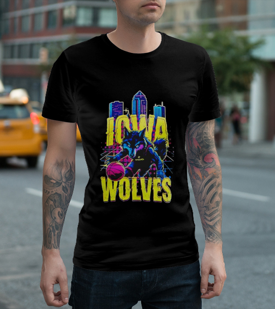 Iowa Wolves Neon Basketball Wolf Skyline T-Shirt