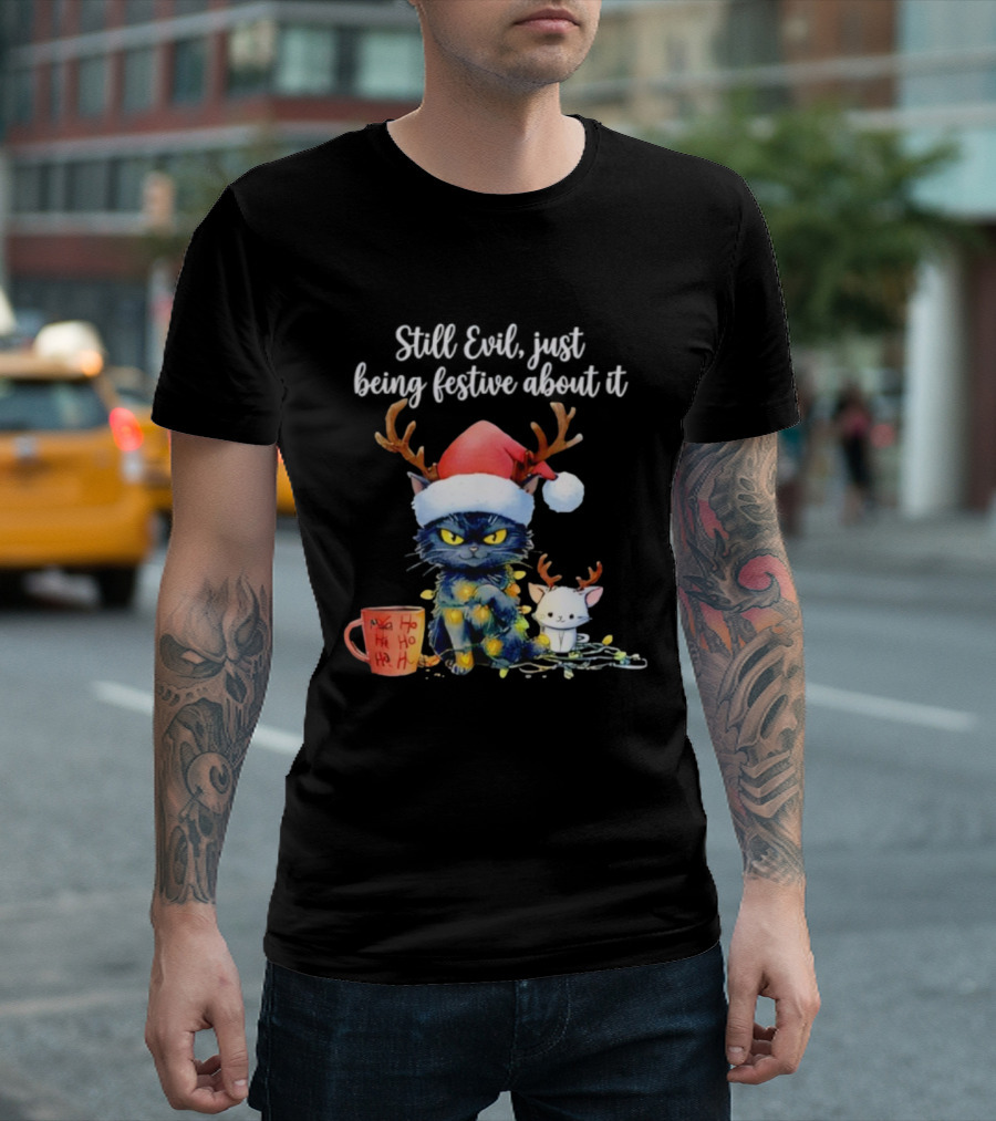 Still Evil Just Being Festive About It Cat Christmas Santa Hat Antlers Lights T-Shirt