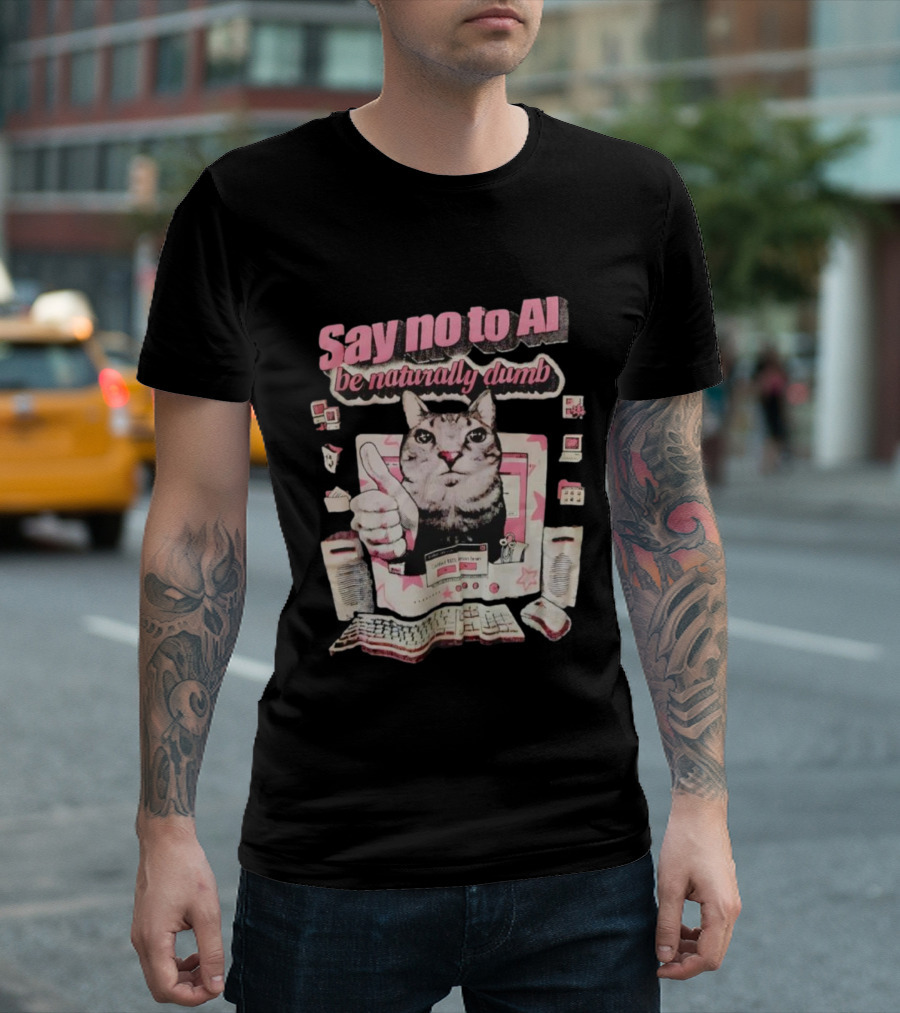 Say No to AI Be Naturally Dumb Cat with Computer and Thumbs Up T-shirt — on-model street pose, front view.