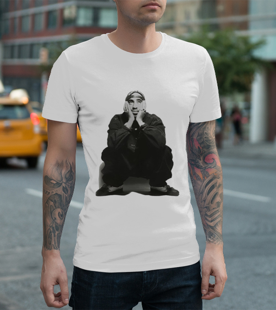 Pedro Pascal Sits Like Tupac Iconic Pose T-shirt — on-model street pose, front view.