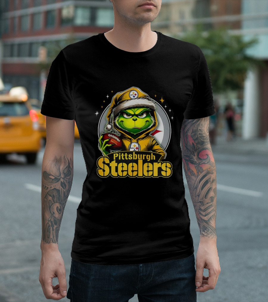 Grinch Wearing Santa Hat Holding Football Pittsburgh Steelers Christmas NFL T-Shirt