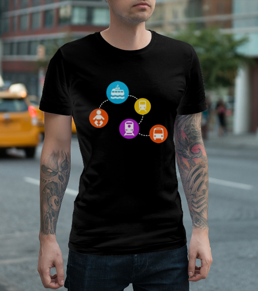 Translink Wayfinding Ferry Train Bus Baby Icon Circles T-shirt — leaning against wall, hands in pockets.