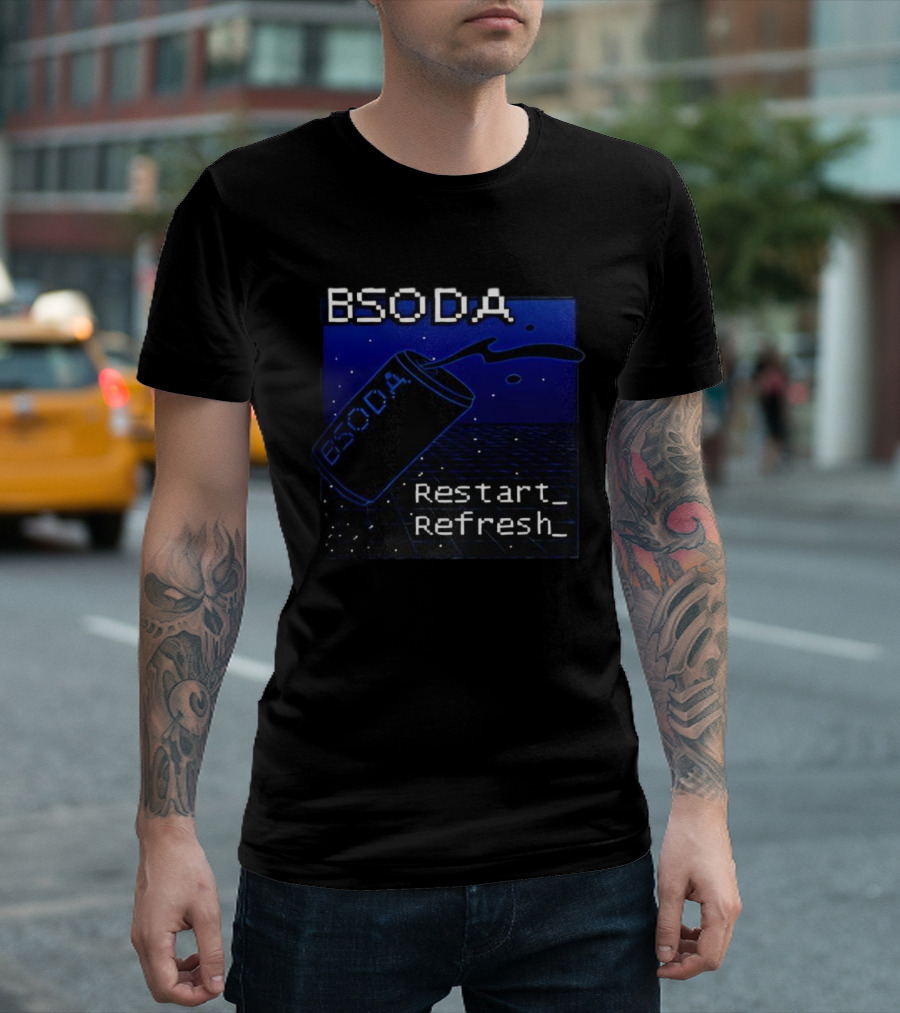 BSODA Can Restart Refresh Pixel Art Aesthetic Retro Digital Style T-shirt — on-model street pose, front view.