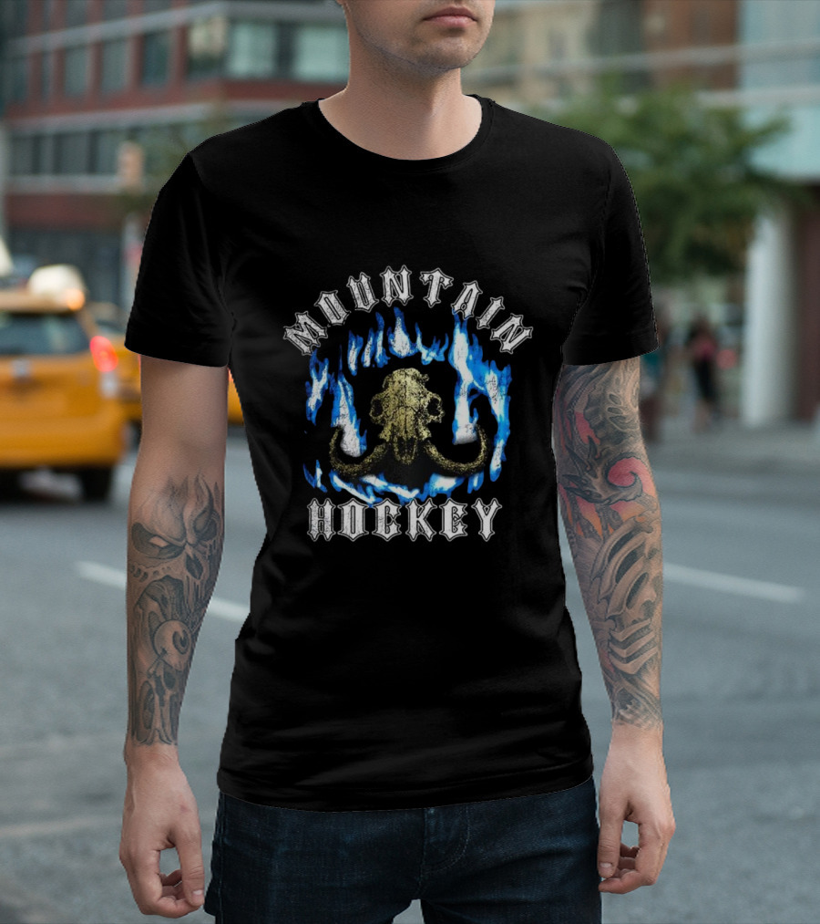 Mountain Hockey Mammoth Skull Blue Flames Design T-Shirt