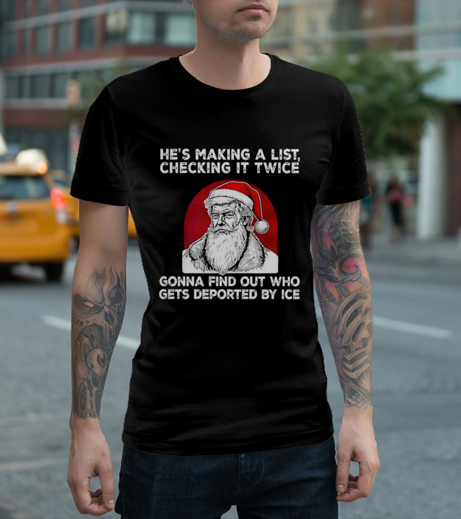 Trump He's Making A List Checking It Twice Gonna Find Out Who Gets Deported By ICE Christmas Santa Hat T-Shirt