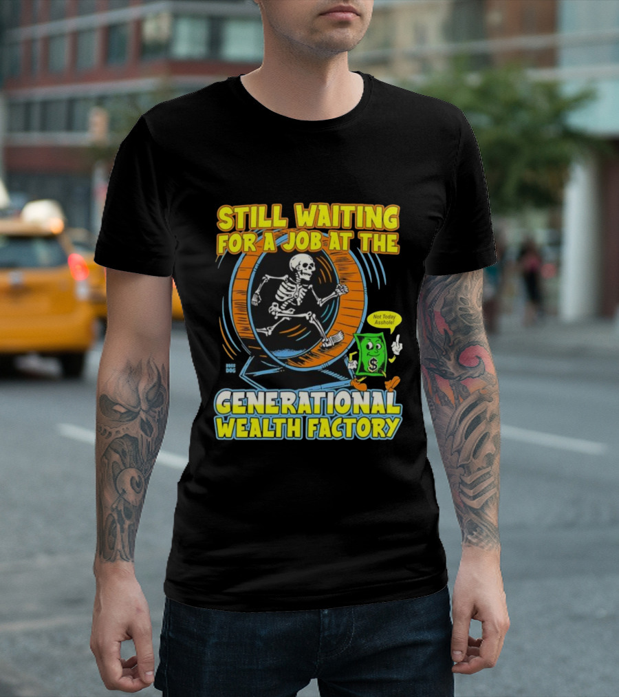 Still Waiting For A Job At The Generational Wealth Factory Skeleton Hamster Wheel T-Shirt