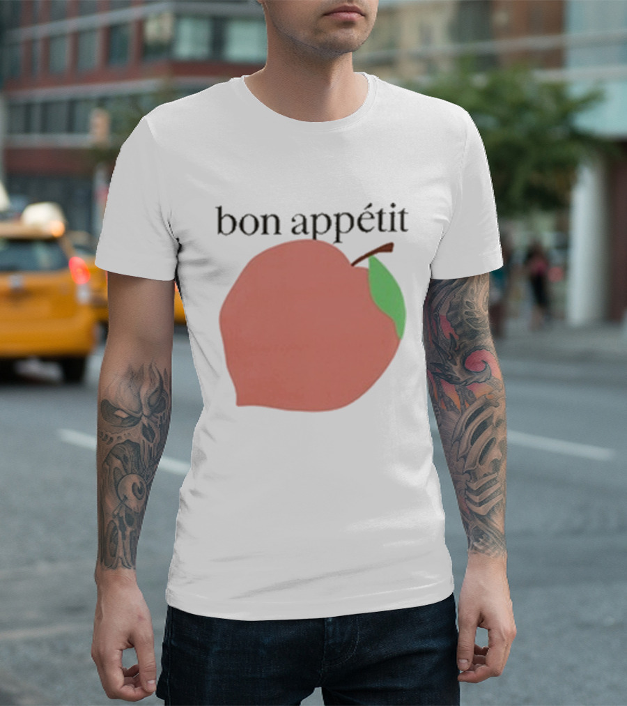 Bon Appétit Peach Illustration With Green Leaf Detail T-Shirt