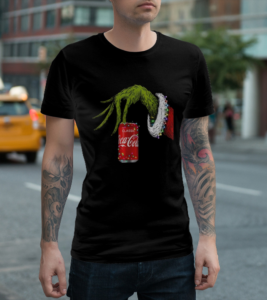 Grinch Hand Holding Coca-Cola Can Wrapped In Christmas Lights Merry Christmas T-Shirt