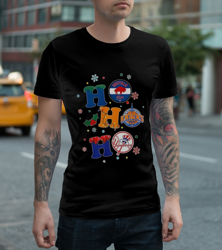 Buffalo Bills New York Knicks Yankees Christmas Ho Ho Ho Snowflakes T-Shirt