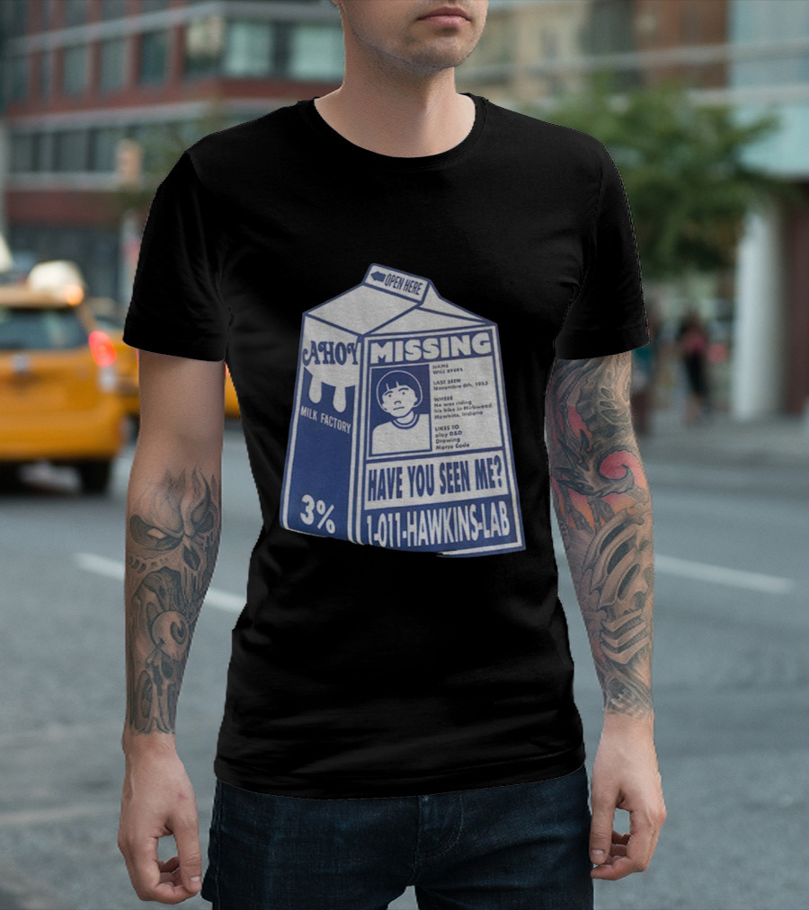 Stranger Things Missing Have You Seen Me 011 Hawkins Lab Ahoy Milk Factory 3 Percent T-Shirt