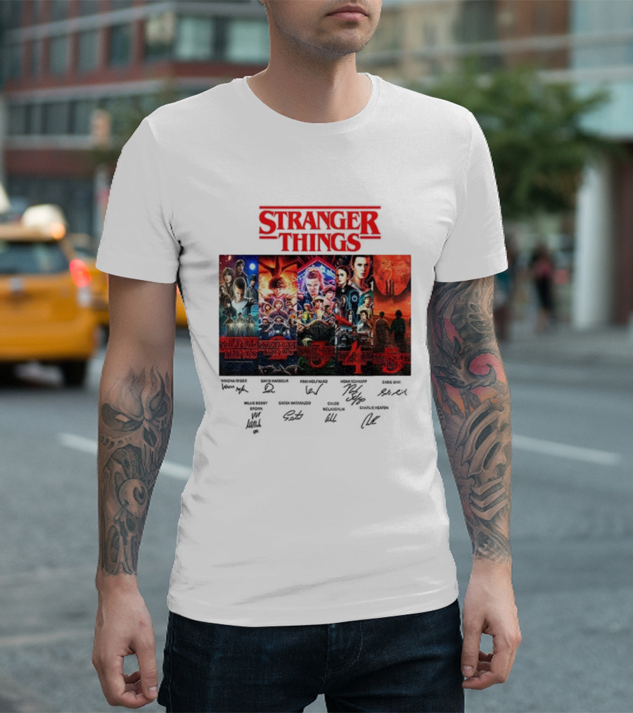 Stranger Things Seasons 1-5 Collage With Cast Signatures And Retro Logo T-Shirt